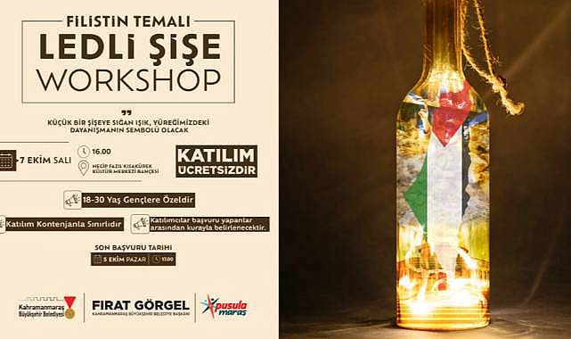 Büyükşehir Belediyesinin gençlik markası Pusula Maraş, Filistin’de yaşanan zulme dikkat çekmek ve farkındalık oluşturmak için atölye çalışması düzenleyecek. 7 Ekim Salı günü gerçekleştirilecek etkinliğe ön başvurular Büyükşehir’in internet adresinden çevrimiçi yapılabiliyor.Kahramanmaraş Büyükşehir Belediyesi, gençlere yönelik anlamlı faaliyetlerini Pusula Maraş çatısı altında sürdürürken, Filistin’de yaşanan zulme dikkat çekmek ve farkındalık oluşturmak amacıyla özel bir etkinliği daha hayata geçiriyor. Gençlik Hizmetleri Şube Müdürlüğü koordinesinde 7 Ekim Salı günü Necip Fazıl Kısakürek Kültür Merkezi bahçesinde düzenlenecek atölyede, “Filistin Temalı Ledli Şişe” çalışması gerçekleştirilecek. 18 – 30 yaş aralığındaki gençlerin katılım sağlayabileceği etkinlikte, küçük bir şişeye yerleştirilecek ışıkla hem dayanışmanın sembolü olunacak hem de Filistin halkına destek mesajı verilecek. Etkinliğe katılmak isteyen gençler, https://kahramanmaras.bel.tr/duyuru/2025/10/01/filistin-temali-ledli-sise-workshop-basvuru-formu internet adresindeki başvuru formunu doldurarak kayıt yaptırabilecek. Son başvuru tarihi 5 Ekim Pazar.