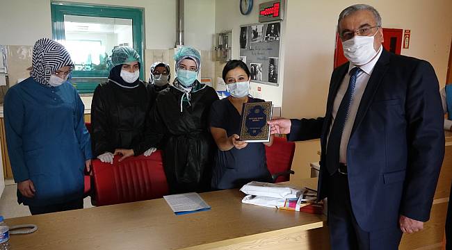 Sağlık çalışanlarına din gönüllüleri adına mektup yazan Sürgeç, Kur’an-ı Kerim ve meali ile Diyanet Vakfı yayınlarına ait “Peygamberimizin Sünnetinde Aile” isimli kitabı ve Ramazan vesilesiyle çikolata ikramında bulundu.Tüm dünyayı etkisi altına alan ve Türkiye’de de hızlı bir şekilde yayılan yeni tip koronavirüs salgınının hem yayılması hem de kaynaklı ölümlerin durması adına özellikle sağlık çalışanları yoğun çaba sarf ediyor. Maske taktıkları için yüzleri yara olan, günlerce uykusuz kalan, ailesi ile telefonla bile irtibat kuramayan sağlık çalışanlarına moral vermek için destek yağıyor. Bu kapsamda Kahramanmaraş İl Müftülüğü ve Diyanet Vakfı’nca kentte görev yapan sağlık çalışanlarına moral vermek adına bir dizi ziyaret programı yapıldı. Kahramanmaraş İl Müftülüğü ve Diyanet Vakfı ile din gönüllülerini temsilen Kahramanmaraş Necip Fazıl Şehir Hastanesi ve Kahramanmaraş Sütçü İmam Üniversitesi Tıp Fakültesi’ni ziyaret eden İl Müftüsü Celal Sürgeç, Necip Fazıl Şehir Hastanesi Başhekimi Uzm. Dr. Vehbi Şirikçi’ye din gönüllüleri adına sağlık çalışanlarına yazdığı mektup ile Kur’an-ı Kerim ve mealinin yanı sıra Diyanet Vakfı yayınlarına ait Peygamberimizin Sünnetinde Aile isimli kitabı sağlık çalışanlarına ulaştırılmak üzere takdim etti. Sağlık çalışanlarının bu süreçte özveriyle çalıştığını belirterek, sağlık çalışanlarına sık sık dua ettiklerini ifade eden Müftü Sürgeç, manevi ve fiziken sağlık çalışanlarının yanlarında olduklarını söyledi. Kahramanmaraş Necip Fazıl Şehir Hastanesi Başhekimi Uzm. Dr. Vehbi Şirikçi ise Müftü Sürgeç’e sağlık çalışanları adına teşekkür etti.“SEVGİNİN İŞARETİ ARTIK UZAK KALMAK”Ziyarette açıklamalarda bulunan Kahramanmaraş İl Müftüsü Celal Sürgeç, dünyadaki insan kalabalığının en yoğun olduğu noktaların insansız olduğunu belirterek, “Bugün insanoğlu küresel bir sıkıntı ve salgınla karşı karşıya. Öyle bir sıkıntı ki, dünyanın en meşhur mekânları şuan da bomboş. Mekke bomboş, Kâbe bugün tavaftan yoksun ve mahzun. Ayriyeten bugün insanların en çok rağbet ettiği, Paris, Londra gibi dünyanın büyük kentleri şuan da gerçekten bomboş bir vaziyette. En çok insanların rağbet ettiği mekânlar maalesef insandan yoksun bir halde. En çok sevdiğimiz insanlarımız yani annemiz ve babamız onlara karşı bugün sevginin işareti uzak kalmak. Hâlbuki yakın kalmamız gerekirken uzak kalmak onları sevmemizin bir işareti haline geldi. Ayriyeten bugün insan birbirine yanaşması gerekirken, birbirinden uzaklaşmaya, birbirini risk olarak görmeye başladı virüs sebebiyle. Şuan da böyle küresel bir sıkıntıyla karşı karşıyayız ama bir kesim var ki aynı insanı biz hem risk olarak görüyoruz ama diğer taraftan insana da sığınıyoruz. O sığındığımız kesim de sağlık kesimi. Ben kendilerine teşekkür ediyorum, Allah yardımcıları olsun” dedi.