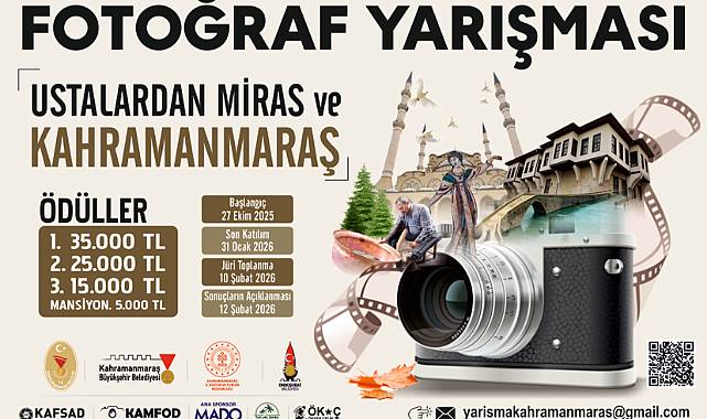 Kahramanmaraş’ın kültürel mirasını birde fotoğraf karelerinden görmek için adım atıldı. Kahramanmaraş’ın kültürünü ve mirasını yansıtmak adına sanat ile buluşturarak geleceğe miras bırakmak için şehrimizde USTALARDAN MİRAS VE KAHRAMANMARAŞ temalı fotoğraf yarışması başlıyor.Kahramanmaraş Büyükşehir Belediyesi, İl Kültür ve Turizm Müdürlüğü, KAFSAD ve KAMFOD iş birliğiyle hayata geçirilen yarışma, kentin zengin kültürel mirasını fotoğraf karelerine yansıtmak için düzenlendi. Mado'nun ana sponsoru olduğu yarışma bugün itibariyle başladığı duyruldu.Yarışma kapsamında verilecek olan ödüller;birinciye 35 bin TLikinciye 25 bin TL,üçüncüye ise 15 bin TL ödül verilecek.Ayrıca 46 fotoğraf sergilenmeye değer bulunacak ve her bir fotoğraf için 1000 TL ödeneceği bildirildi.18 yaş üstü, amatör ve profesyonel tüm fotoğrafçılar katılabilecek.yarismakahramanmaras@gmail.com Adresinden başvurular alınacaktır.Başlangıç Tarihi: 27 Ekim 2025Son Başvuru Tarihi: 31 Ocak 2026Sonuç ve Ödül Töreni: 12 Şubat 2026
